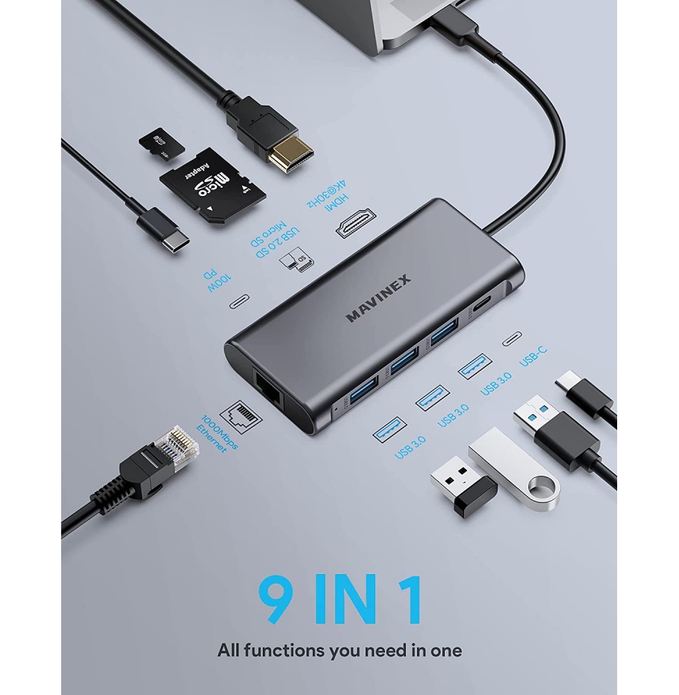 USB C Hub 9 in 1, MAVINEX USB C Adapter 4K to HDMI, 100W Power Delivery, 5Gbps USB-C Data Port, 3 USB 3.0 Ports, MicroSD/TF, 1Gbps Ethernet Docking Station for MacBook, Dell XPS, More Type C Devices